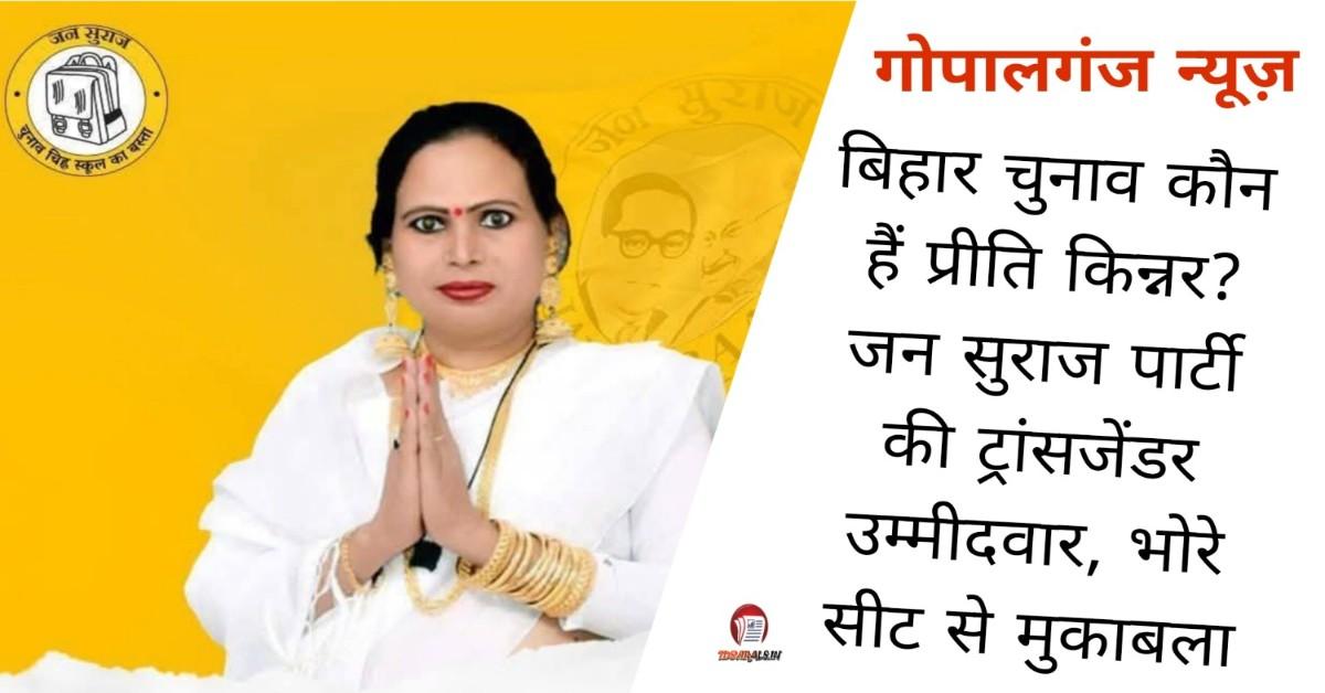 गोपालगंज टीडीएस वायरलस संवाददाता: आगामी बिहार विधानसभा चुनाव 2025 में इस बार कई नए चेहरे और समाजसेवी राजनीति में कदम रख रहे हैं। इन्हीं में एक नाम पूरे बिहार में चर्चा का विषय बना हुआ है — प्रीति किन्नर, जिन्हें जन सुराज पार्टी (JSP) ने गोपालगंज जिले की भोरे (अनुसूचित) विधानसभा सीट से उम्मीदवार बनाया है।